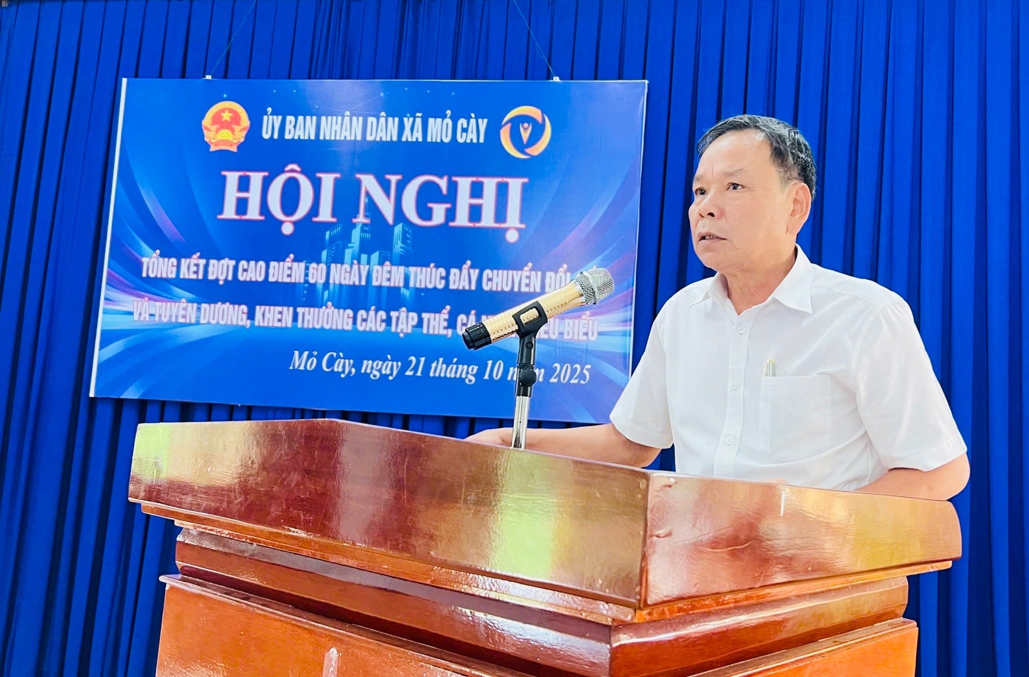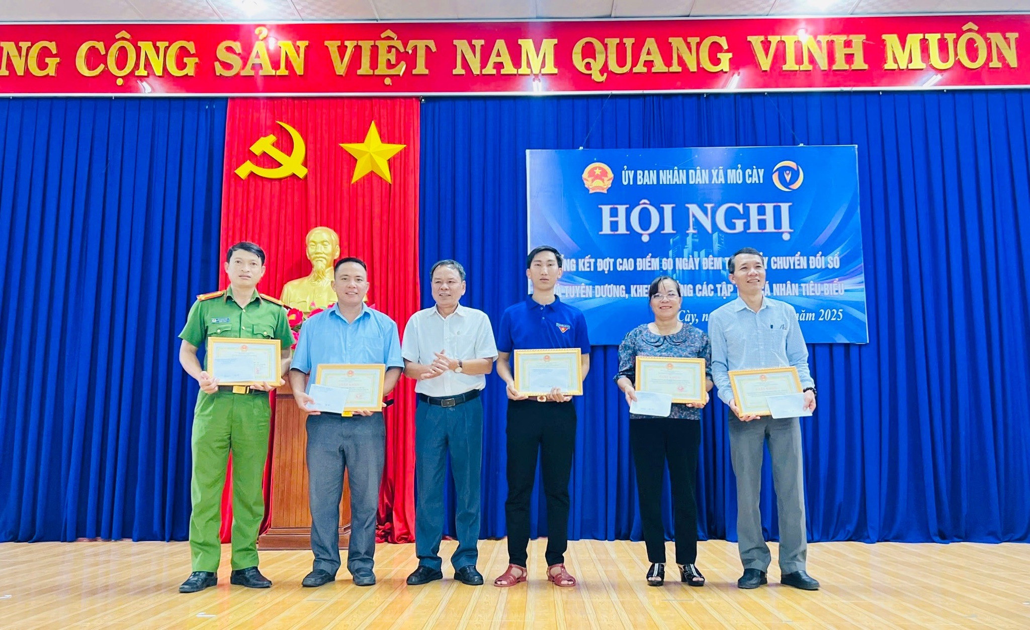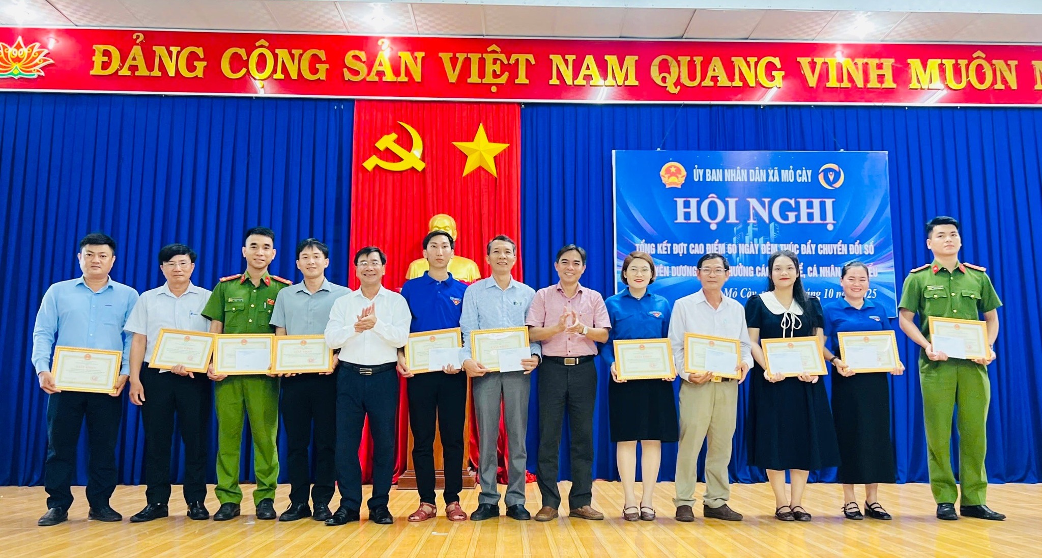 Dịp này, UBND xã Mỏ Cày đã tặng giấy khen cho 05 tập thể và 12 cá nhân có thành tích xuất sắc trong thực hiện Cao điểm 60 ngày đêm về thúc đẩy, nâng cao hiệu quả dịch vụ công trực tuyến trên địa bàn xã.