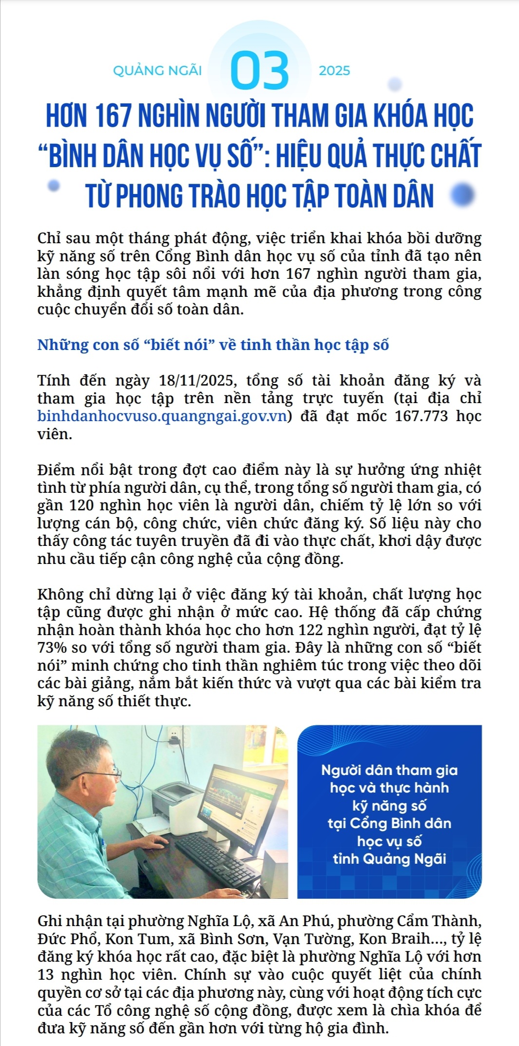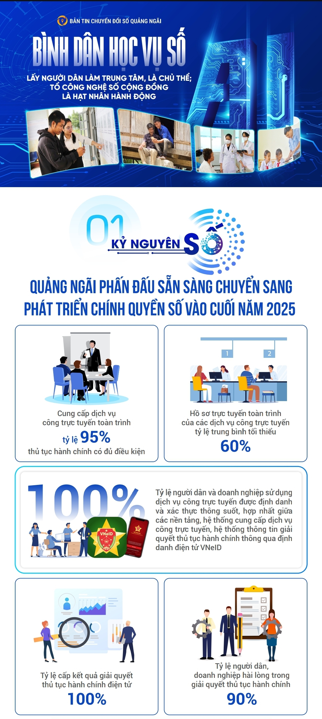 Chuyên trang Chuyển đổi số tỉnh Quảng Ngãi trân trọng giới thiệu Bản tin Chuyển đổi số, số 7 năm 2025 với chủ đề "Bình dân học vụ số: Lấy người dân làm trung tâm, là chủ thể; Tổ công nghệ số cộng đồng là hạt nhân hành động".